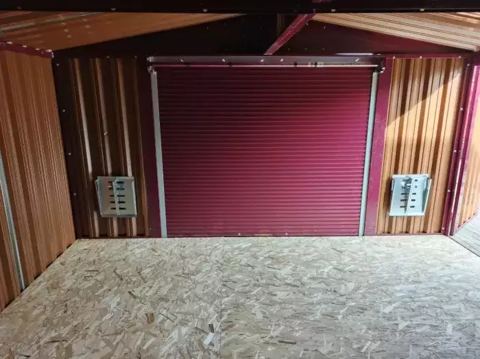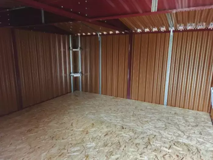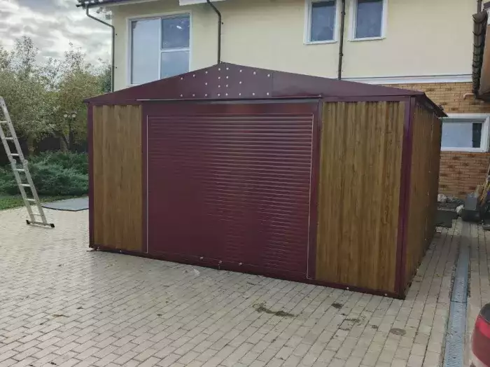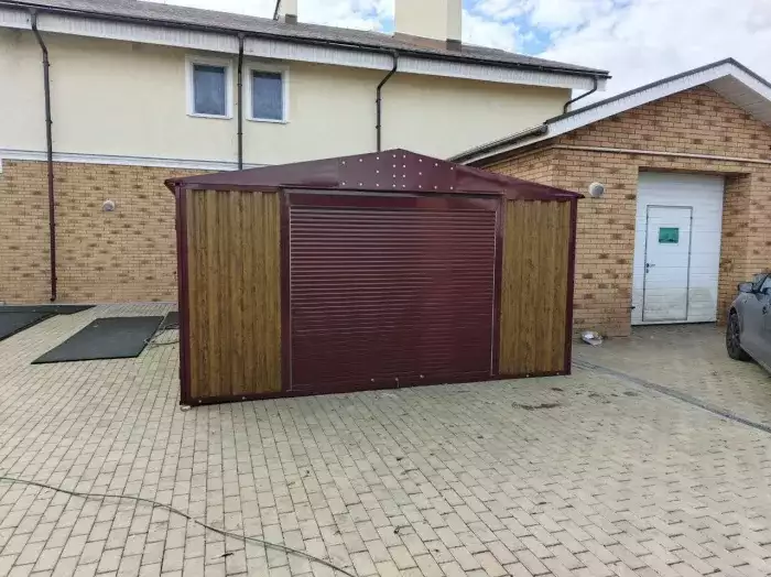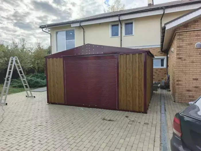 Нами были изготовлены две одинаковые 4-метровые конструкции с двускатной крышей и торцевой воротной группой в строгом графитовом цвете RAL 7024.