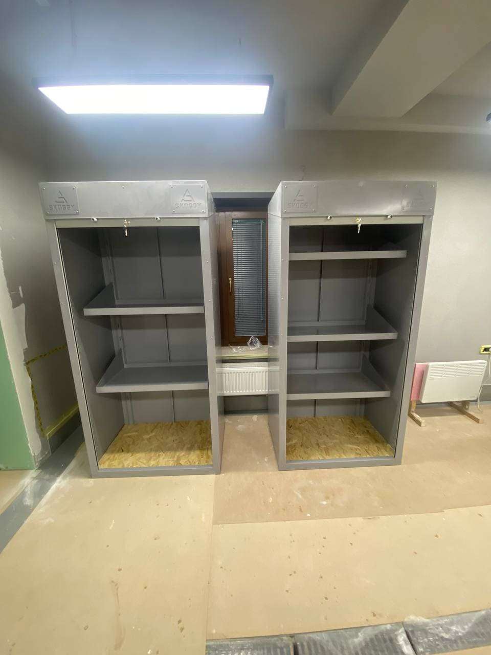 Дополнительно шкафы оборудованы металлическим полом и пятью полками для хранения.