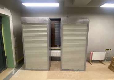 Нами было изготовлено две конструкции шкафа размером 1,2 х 1,0 х 0,65 м с рольставнями в светло-сером цвете RAL 7004.