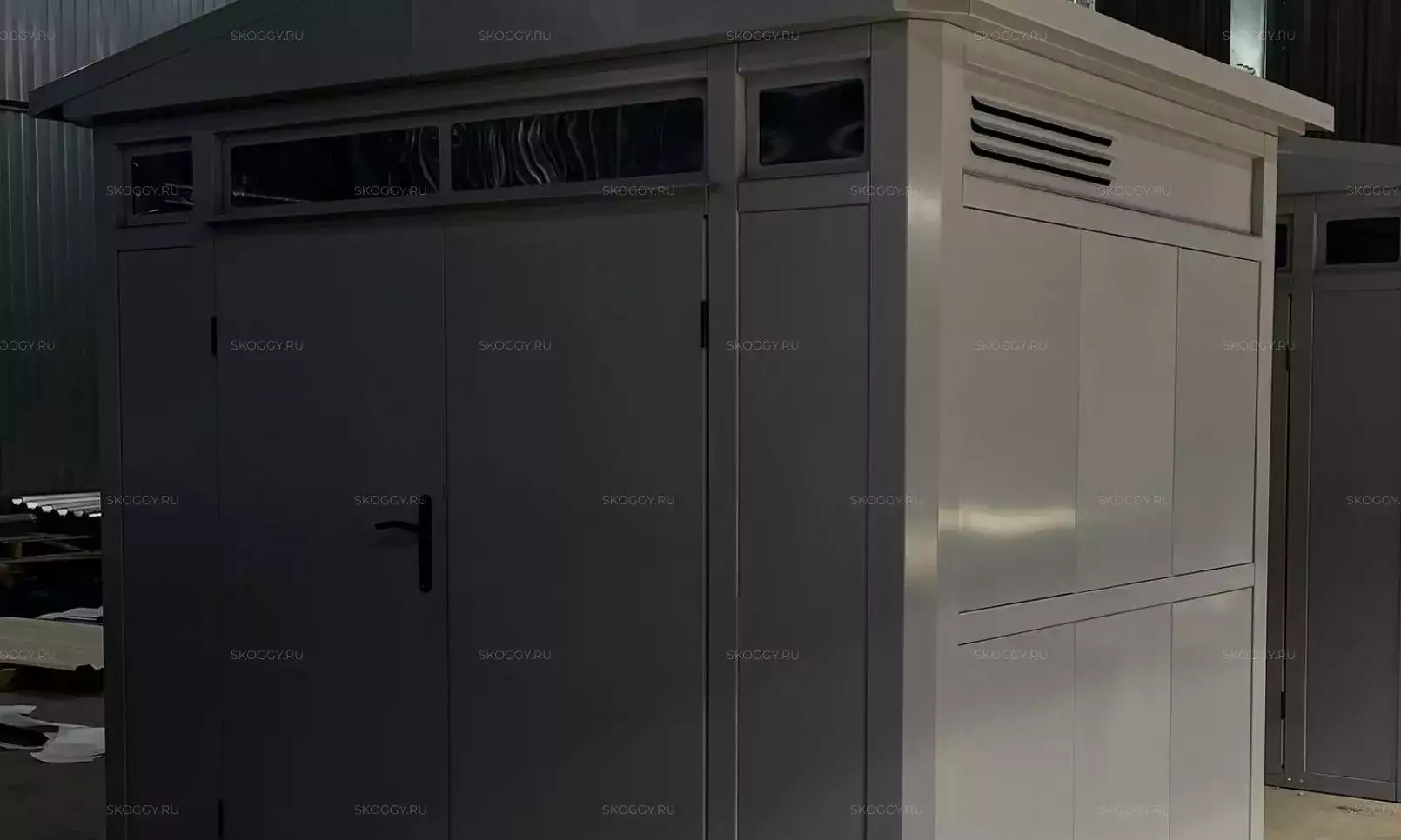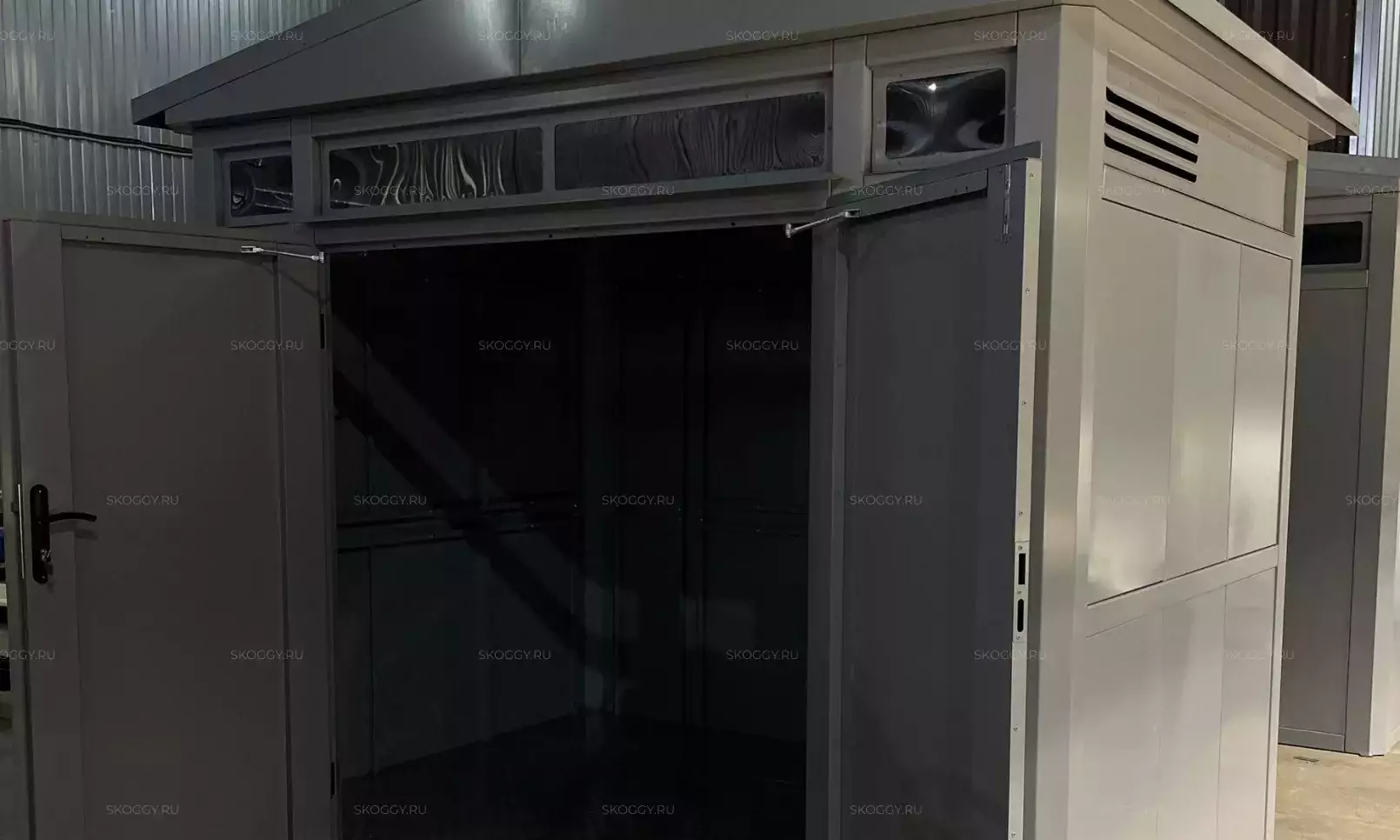 Хозблок выполнен в одном из популярнейших цветов цвете RAL 8017 c двускатной крышей, дополнительно укомплектован двумя прямыми стеллажами с тремя полками, а также системой хранения инвентаря, системой подвесов и системой освещения на солнечной батарее. Укомплектовали по полной :)